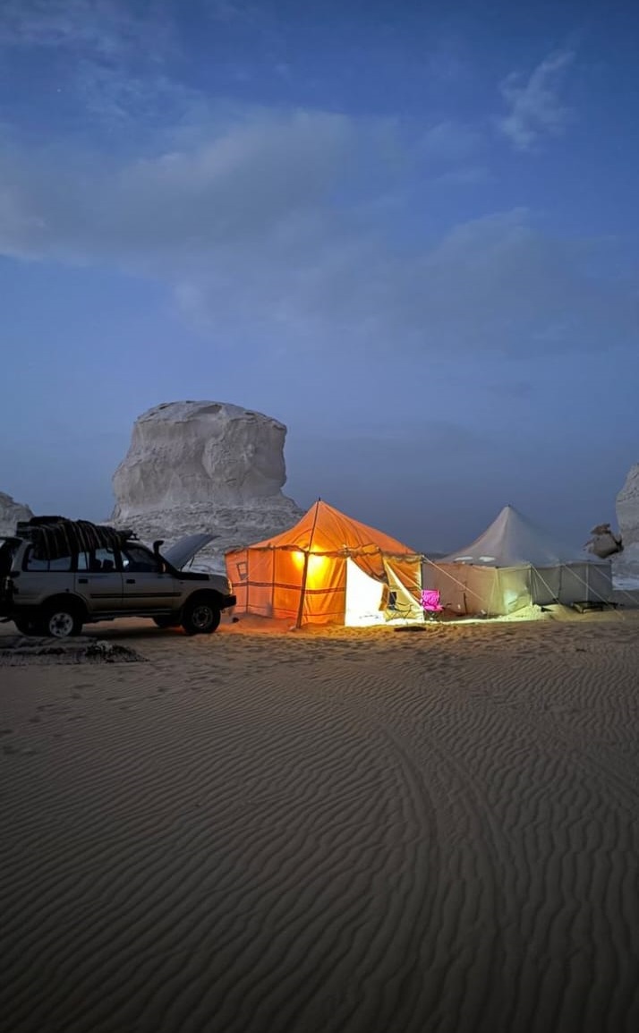 We start from cairo driving towards baharia oasis when we arrive we have our lunch then we find our jeep ready to start our safari trip , we visit the black desert then el hez village and the cold spring after that we drive to visit the crystal mountain then aqapat area and finally we drive reaching the white desert camping area , we visit mushrooms area , the tents area and all the nice formations of limestone and we find a nice spot to make our camp for dinner and spending the night under the stars.